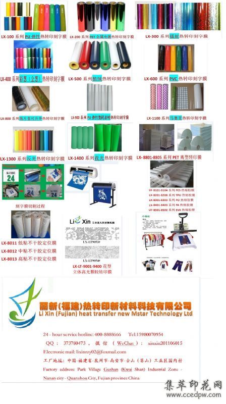 转印油墨类;热熔胶水、油性油墨、水性白胶浆、调色浆、弹透浆、助剂、热熔粉(PU,PES,PA)感光胶,晒版胶水,数码打印墨水,热撕平光离型剂,冷撕哑光离型剂,冷撕哑光离型剂,冷热撕离型剂等。。。。